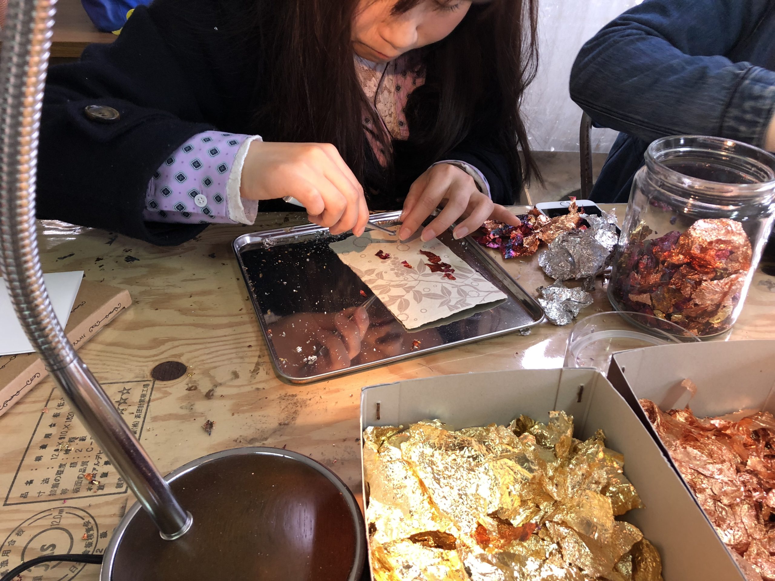 内子町は古くから和紙づくりが盛んで、この地域でつくられる和紙は「大洲和紙」と呼ばれ、愛媛県を代表する工芸品として書道用の半紙や障子紙として重宝されてきました。この伝統文化の継承と発展のために創業された「五十崎社中」(いかざきしゃちゅう)は、手すき和紙とフランス伝統のギルディング技法を融合させた独自の「ギルディング和紙」を開発しました。ギルディングとは、薄く伸ばした金属箔で模様を描く技法で、ヨーロッパでは陶器・ガラス、家具や内装に幅広く装飾に使われています。この体験では、手すき和紙のハガキにギルディングを施して、自分だけのオリジナル作品をつくることができます。