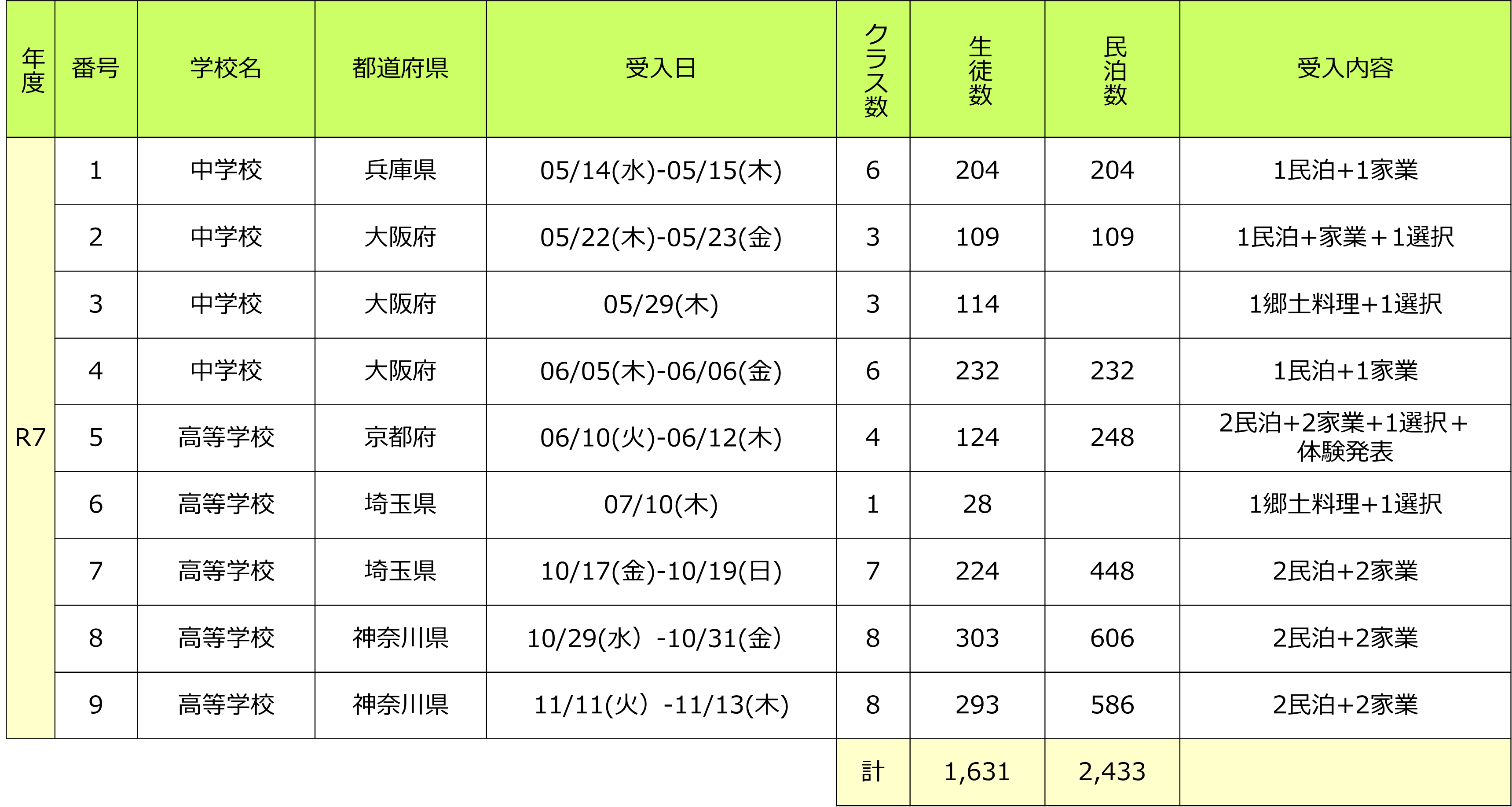 | 年度 | 番号 | 学校 | 都道府県 | 受入日 | クラス数 | 生徒数 | 民泊数 | 受入内容 |